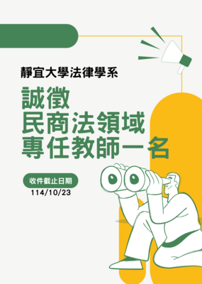 靜宜大學法律學系誠徵民商法領域專任教師一名【收件至10/23】
